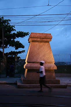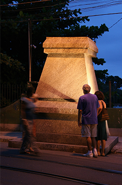 Esta intervenção vem agregar mais reflexão ao desejo de repensar a função do monumento na contemporaneidade. Convidado a ocupar um espaço público no bairro de Santa Teresa/RJ, em 2007, pelo período de um final de semana, mediante as condições estruturais para intervir onde quisesse, decidi reconstruir uma base escultórica, cenograficamente, num local inusitado à sua instalação: entre o meio fio, a calçada e a rua. “AO MONUMENTO”, ativa esse “vazio”que está sobre o pedestal, cujo deslimite transborda para uma exterioridade indeterminada. Qual intenção tem uma base de monumento, abandonada num local incomum, sem nenhuma indicação do que deseja referenciar? Qual ocupação gostaria de construir nessa base?. Sua missão não era apenas remeter a um pedestal, mas a de “ser” um pedestal. Com sua construção e “pintura de arte” feitas por técnicos contratados, altamente especializados, “AO MONUMENTO”, se tornou um sedutor e ao mesmo tempo enigma. Fotos: Wilton Montenegro.