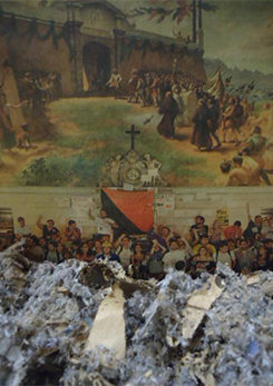 “Fora de ordem” é um monumento que dialoga com a série “instantâneos”. Este trabalho, que se apropria de uma foto da primeira página de um jornal, registrando a ocupação do plenária na câmera de vereadores do Rio de Janeiro, por populares, conjuga várias forças, entre elas, memória, poder e utopia/ficção. Ampliando o embate entre essas forças, temos um grande e curioso painel de Rodolfo Amoedo “A Fundação da Cidade do Rio de Janeiro no Morro do Castelo”, assinado e datado de 1923. “Apesar de falsear a verdade (o forte não estaria construído na ocasião, além de a fundação ter acontecido em 1º de março de 1565, no Morro Cara de Cão)” _ texto retirado da página da câmera dos vereadores/RJ em 2020_, este painel potencializa de forma dramática a cena registrada. Em continuidade à linha de reflexão, agreguei à foto, um punhado de jornal ralado com noticiário político, e dispus ambas as partes, em uma caixa comum de doces populares, que semiaberta, graças à pressão rosqueada de um pequeno “sargento”, adquiriu ares de um modesto palco italiano. Fotos do Artista.