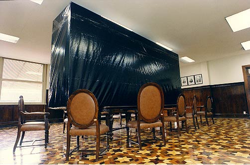 “81 ao lado da Guardamoria”, foi um projeto coletivo de ocupação do prédio sede da Alfândega, na zona portuária do Rio de Janeiro, em 1997. A montagem da exposição, que permaneceu pelo período de um mês, foi feita num fim de semana, sem que os funcionários que trabalhavam no local soubessem do evento. Optando por me apropriar do salão nobre, espaço no qual a diretoria fazia sistematicamente seus encontros, construí uma grande caixa preta de tamanho próximo a alguns containers para exportação , medindo 220 x 500 x 100 cm, depositada sobre a mesa de reuniões. Fotos : Cláudia Laborne Valle.