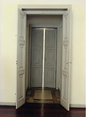 Intervenção realizada em 1995 no Solar Grandjean de Montigny, PUC/RJ. Esta residência localizada dentro do campus universitário, foi moradia deste integrante da missão francesa que, no século 19, entre outras construções na capital, implementou a Academia Imperial de Belas Artes, a convite de D. João VI, para formar uma nova geração de artistas e arquitetos. No âmbito pessoal, fui vizinho da PUC/RJ desde o meu primeiro ano de vida até aos quatorze anos de idade, sendo este ambiente a continuação do jardim de minha casa. Assim, as histórias se entrelaçam, com minha convivência com a PUC e esta casa em específico, que era um tanto abandonada e envolta em mistérios. Por fim, este trabalho que me foi muito valoroso, trata também de camadas mais profundas dos afetos, já que meu pai teve um envolvimento no mínimo “paternal” com a PUC e minha curta relação com ele, atravessou várias intempéries . Com toda esta carga simbólica não caberia outra referência à intervenção a não ser S/Título. Objetivamente a sala redonda, dizia-se de encontros da maçonaria ali, teve seu acesso impedido ao público, restando uma pequena fresta para entrevê-la. Esvaziada, convida o espectador a ocupá-la parcialmente, apenas através do olhar. Fotos: Vicente de Mello.