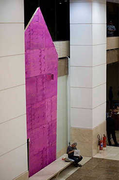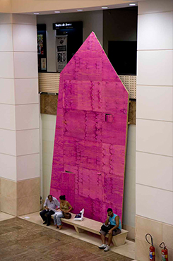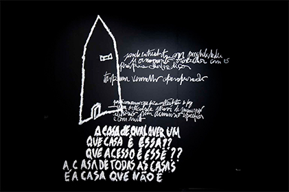 Esta intervenção nasceu a partir de um convite em 2010, para ocupação do espaço Caixa Cultural/RJ _ algumas galerias e o hall de entrada _ na exposição coletiva Projetos (in)provados. A partir de um jingle sobre a Caixa Econômica Federal _ órgão principal de financiamento da casa popular, que ficou conhecido nacionalmente _ procurei tratar esta questão de maneira lúdica, como alegoria aos sucessivos enganos a que foram submetidas as populações carentes quanto às políticas habitacionais de aquisição da casa própria. A fachada de uma simbólica casa popular, feita de tapume barato, numa escala monumental, 8 metros de altura, tem como referência sua porta, que se mantém semi-aberta enquanto ninguém se aproxima. Num raio de 4 metros, ao se aproximar um transeunte, a porta se fecha, com um ruído típico de porta enferrujada. Essa ação gerou respostas muito instigantes, na sua relação com o público, que não necessariamente circulava pelo foyer para visitar a exposição. Fotos: Beto Felício.