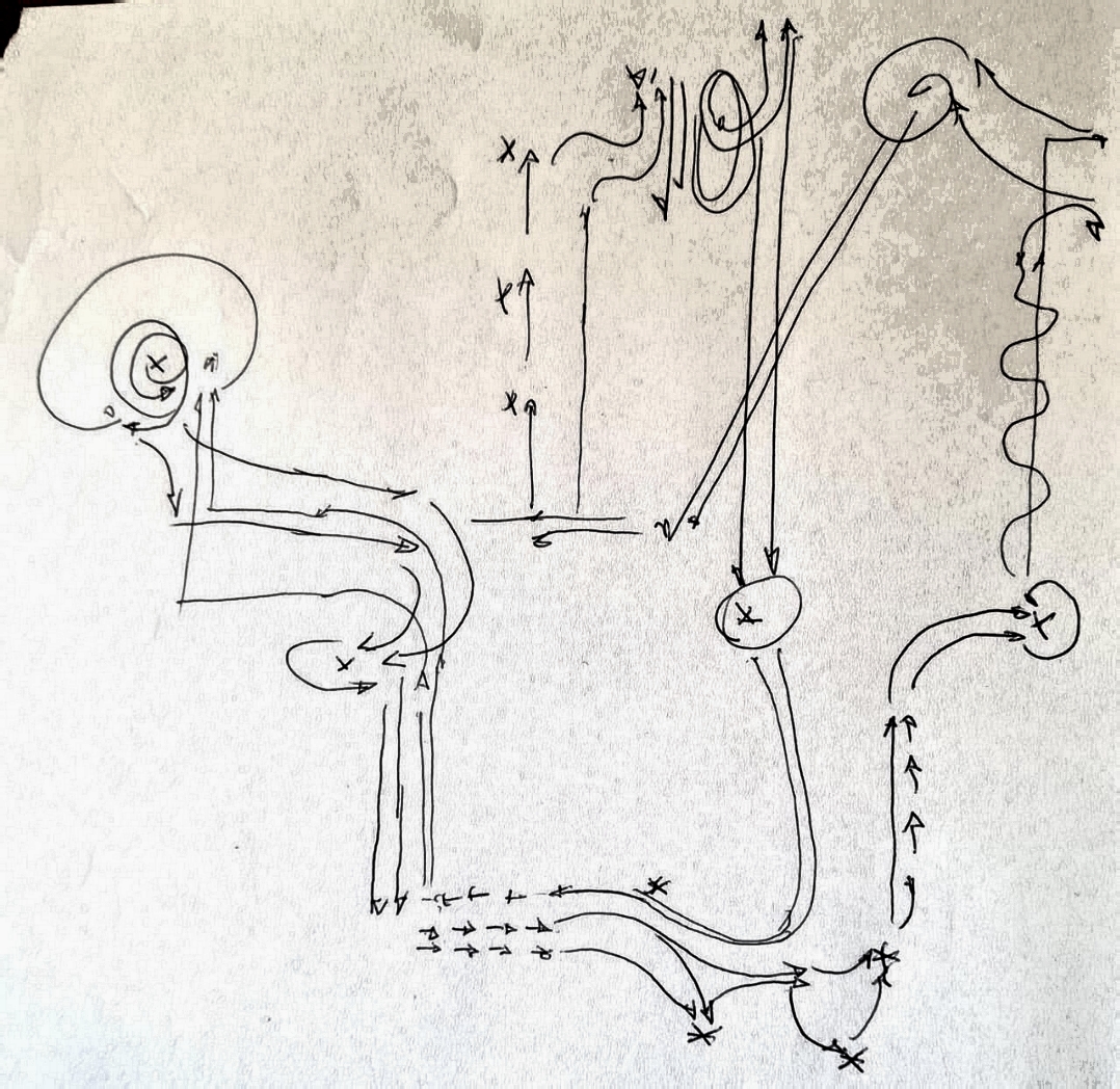 Trabalhamos a partir de um esboço de percurso, desenhado por nós dois, pensando questões relacionadas ao tempo, espaço, cidade, história, memória e mais….